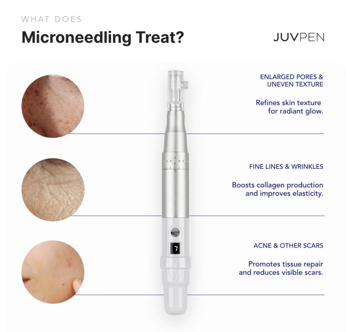 The JuvPen J1 uses controlled microchannels to stimulate the skin’s natural healing response, triggering increased collagen and elastin production—the foundational elements of skin strength, elasticity, and texture. This mechanism supports improvements in:- Fine lines and wrinkles